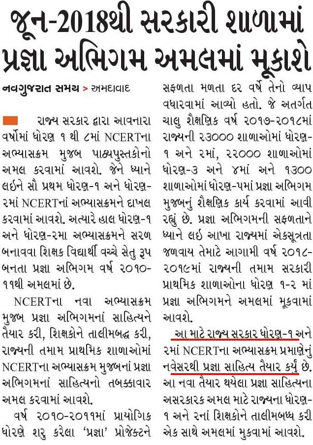JUNE-2018 THI SARKARI SHALA MA NCERT MUJAB NAVESAR THI PRAGNA ABHIGAM MUJAB SAHITYA TAIYAR KARVA MA AAVYU- NEWS REPORT PAR EK NAJAR.